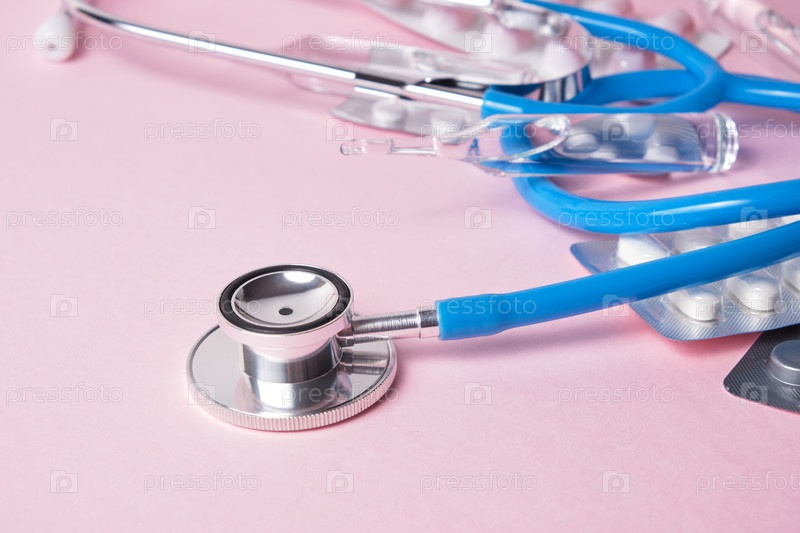 Медицинское оборудование, стетоскоп, ампулы и шприц на розовом фоне