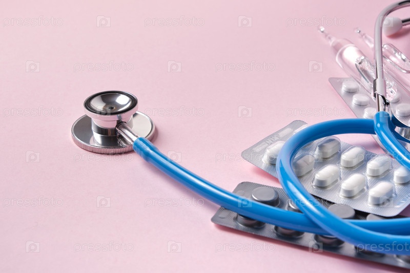 Медицинское оборудование, стетоскоп, ампулы и шприц на розовом фоне