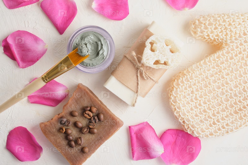 Розовые лепестки роз, косметическая голубая глина, мочалка, щетка, мочалка, какао-мыло и цветы на светлом фоне спа-концепция