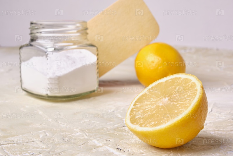 Губка, сода в банке и лимоны для эко-чистки, нетоксичные моющие средства, две концепции, образ жизни без отходов