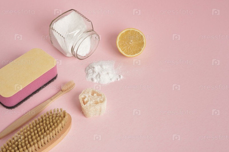 Экологически чистые натуральные чистящие средства и продукты на розовом фоне, концепция очистки без отходов. Концепция моющих средств без пластика