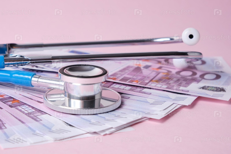Стетоскоп и банкноты евро на розовом фоне, символ стабильности, роста и падения валют, мониторинг обменного курса на бирже