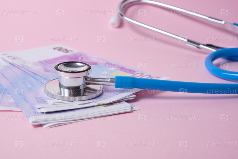 Стетоскоп и банкноты евро на розовом фоне, символ стабильности, роста и падения валют, мониторинг обменного курса на бирже