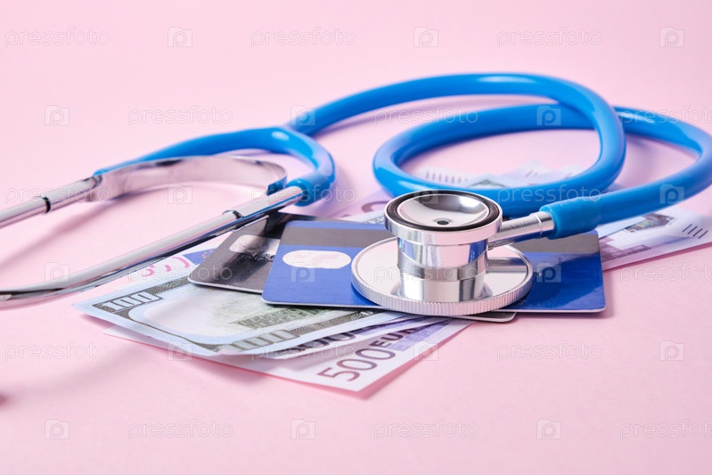 Стетоскоп, кредитные карты и банкноты евро на розовом фоне, концепция влияния пандемии коронавируса и кризиса на обменные курсы