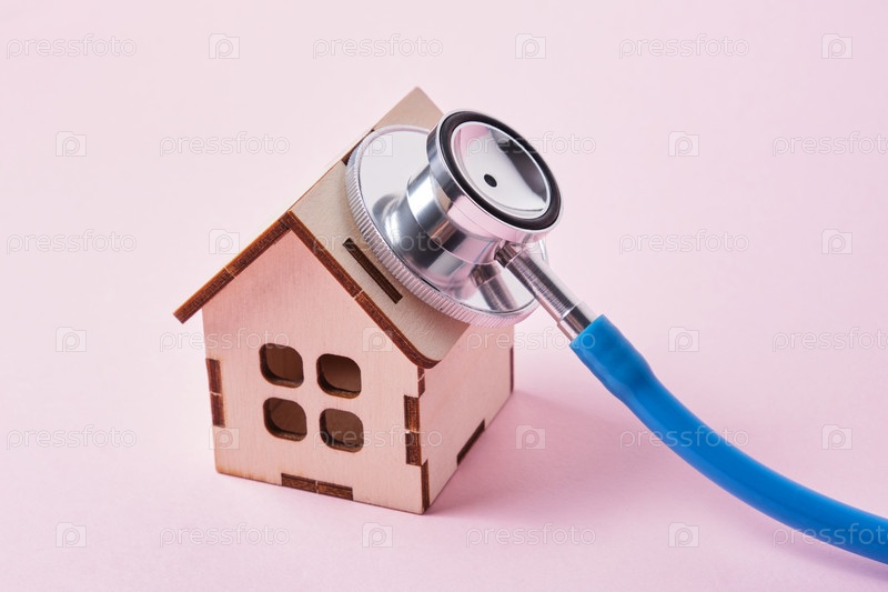 Медицинский стетоскоп и игрушечный домик на розовом фоне с копией пространства