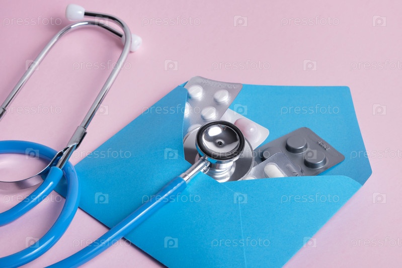 Таблетки в синем конверте и медицинский стетоскоп на розовом фоне