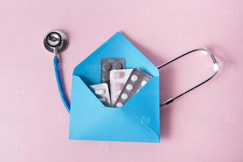 Таблетки в синем конверте и медицинский стетоскоп на розовом фоне