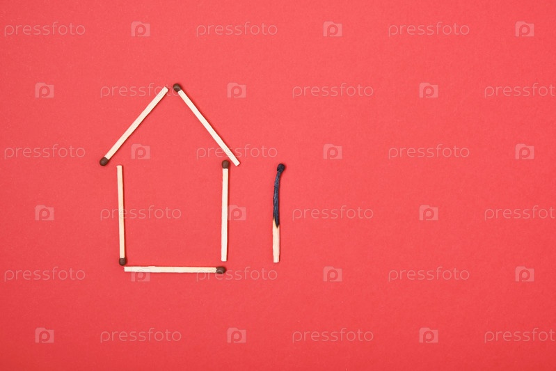 Силуэт дома из сгоревших спичек на красном фоне