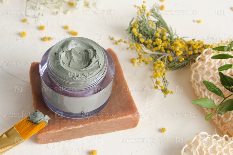 Косметическая голубая глина, мочалка, щетка, люфа, мыло какао и цветы на светлом фоне