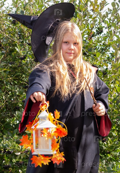 Хэллоуин. Девочка в мантии и шляпе. Маленькая волшебница в костюме