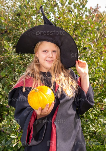 Хэллоуин. Девочка в мантии и шляпе. Маленькая волшебница в костюме
