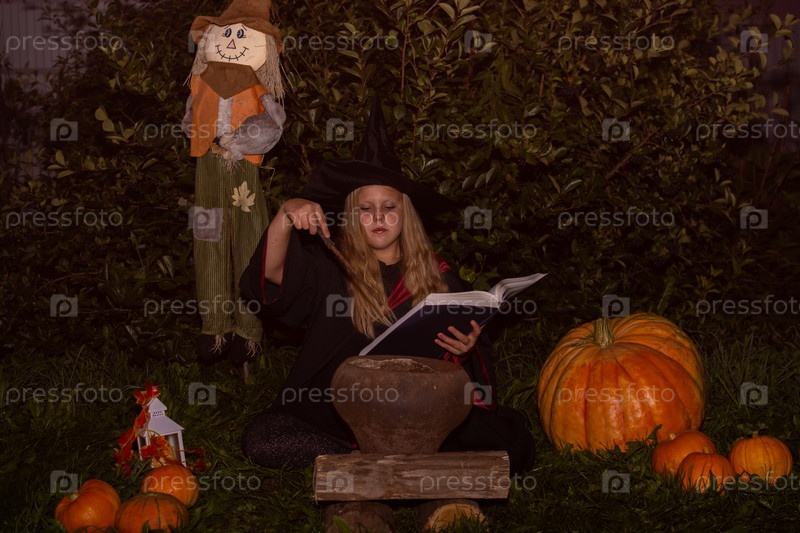 Хэллоуин. Девочка в мантии и шляпе. Маленькая волшебница в костюме
