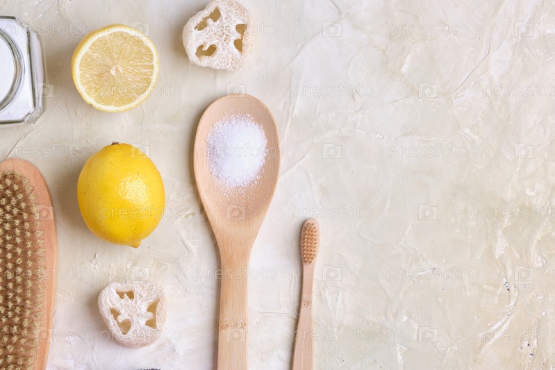 Концепция экологической очистки, натуральные нетоксичные моющие средства, образ жизни без отходов, место для копирования сверху, светлый фон