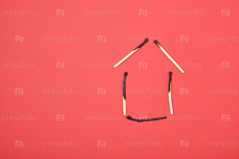 Силуэт дома из сгоревших спичек на красном фоне