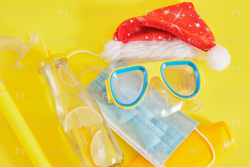 Набор для дайвинга, защитная медицинская маска, шапка санта-клауса, солнцезащитный крем и бутылка лимонада на желтом фоне