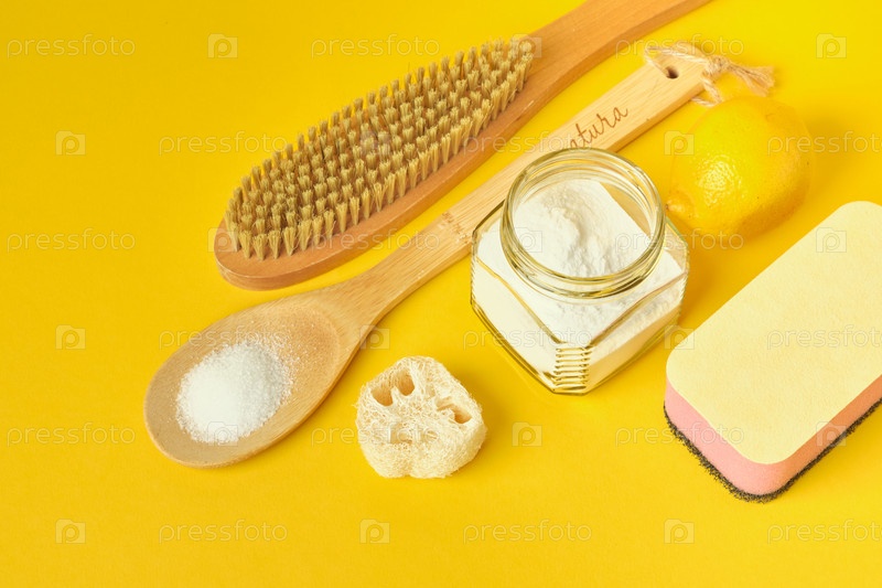 Концепция очистки без отходов, банка содовой, деревянная щетка, лимон, лимонная кислота, губка и мочалка на желтом фоне, вид сверху на пространство для копирования