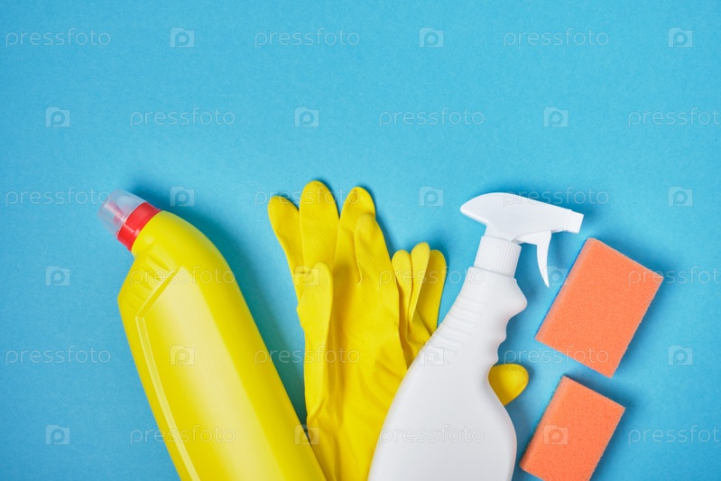 Губки, желтые резиновые перчатки и моющее средство в распылителе на синем фоне