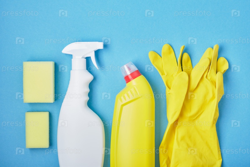 Губки, желтые резиновые перчатки и моющее средство в распылителе на синем фоне