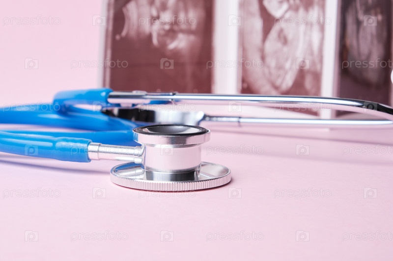 Медицинский стетоскоп и изображение эмбриона на розовом фоне