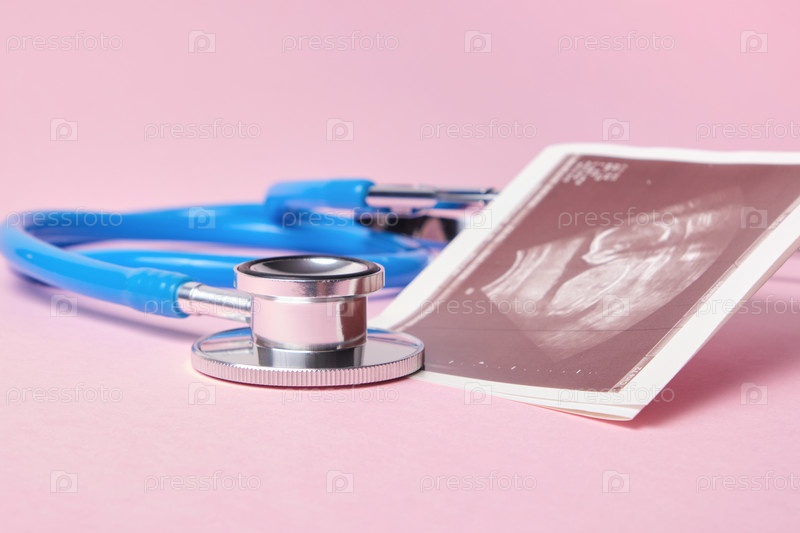 Медицинский стетоскоп и изображение эмбриона на розовом фоне