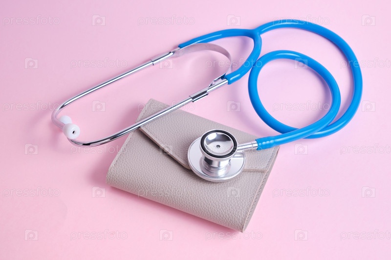 Стетоскоп на старом кошельке на розовом фоне