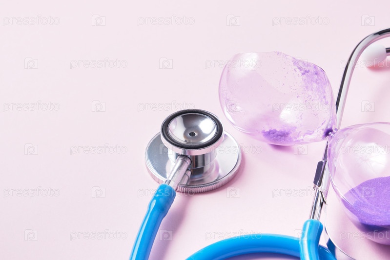 Проверка времени и тайм-менеджмент. стетоскоп и разбитые песочные часы на розовом фоне