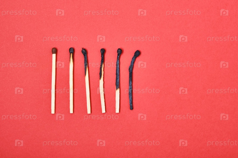 Различные этапы горения спички на красном фоне