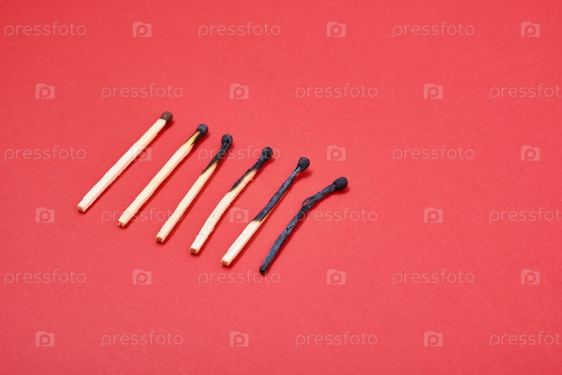 Различные этапы горения спички на красном фоне