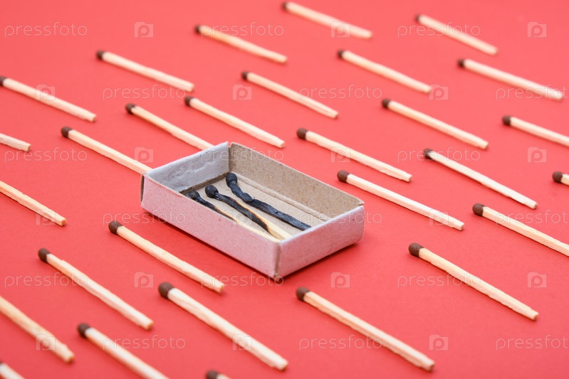 Узор из спичек и коробка сгоревших спичек на красном фоне