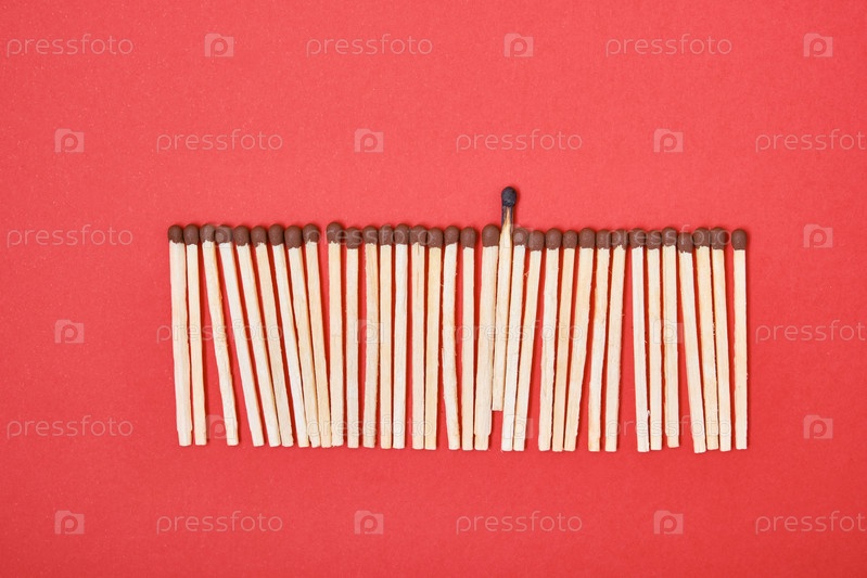 Спички подряд на красном фоне, одна перегоревшая спичка среди новых