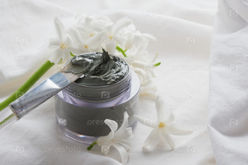 Цветы гиацинта и голубая глина в банке на белой ткани