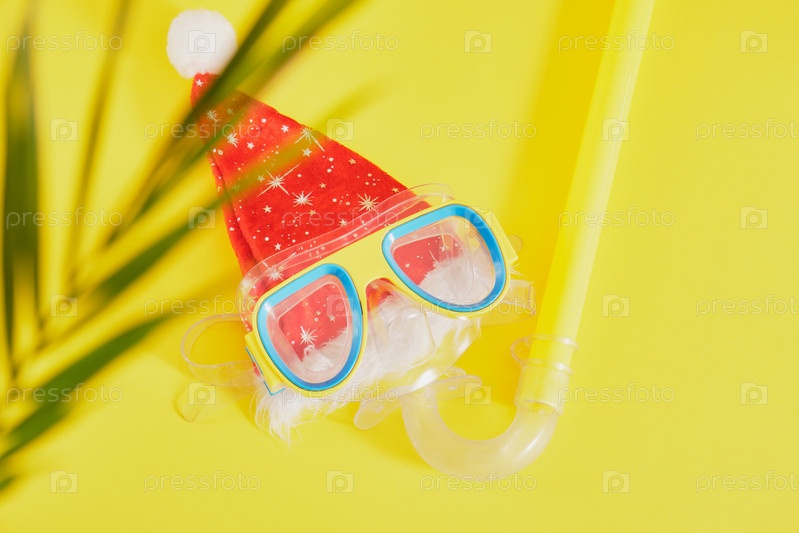 Набор для подводного плавания, шапка санта-клауса и пальмовый лист на желтом фоне, рождественские каникулы на пляже