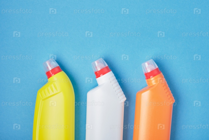 Бутылки с моющими средствами, моющие средства для туалета и сантехники на синем фоне