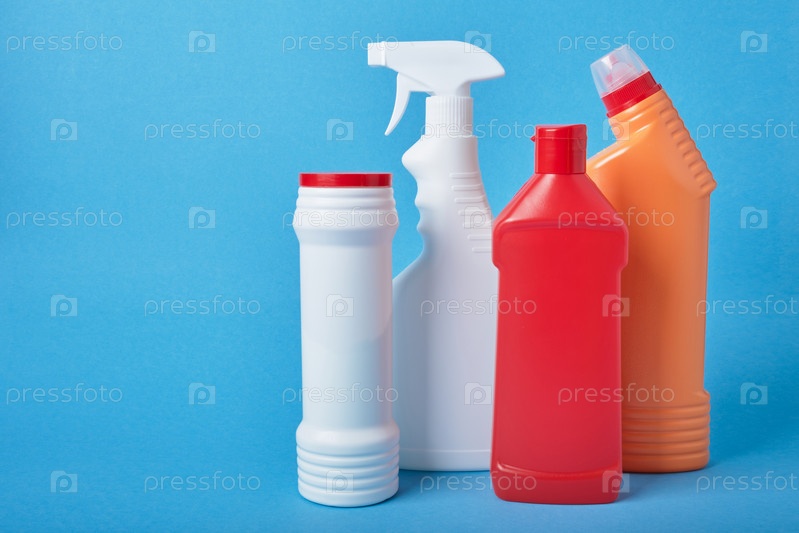 Различные типы белых пластиковых бутылок без этикеток для моющих средств на голубом фоне, вид сверху, копия пространства