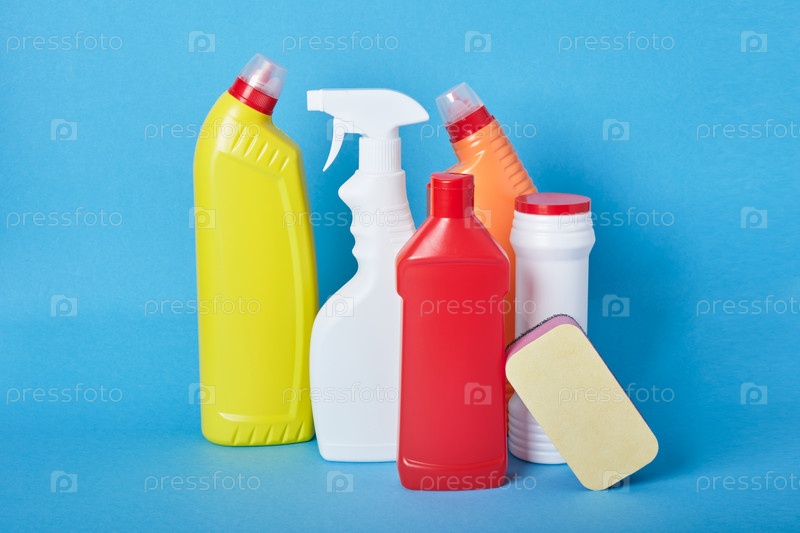Различные типы белых пластиковых бутылок без этикеток для моющих средств на голубом фоне, вид сверху, копия пространства