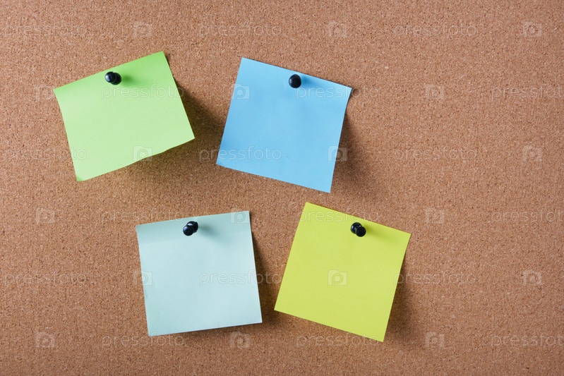 Несколько цветных наклеек для заметок, прикрепленных к пробковой доске