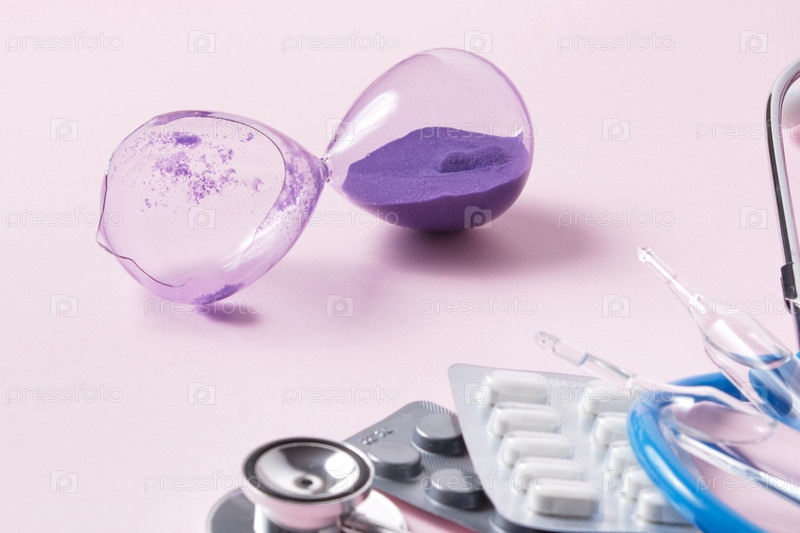 Стетоскоп, сломанные песочные часы и лекарство на розовом фоне копией пространства