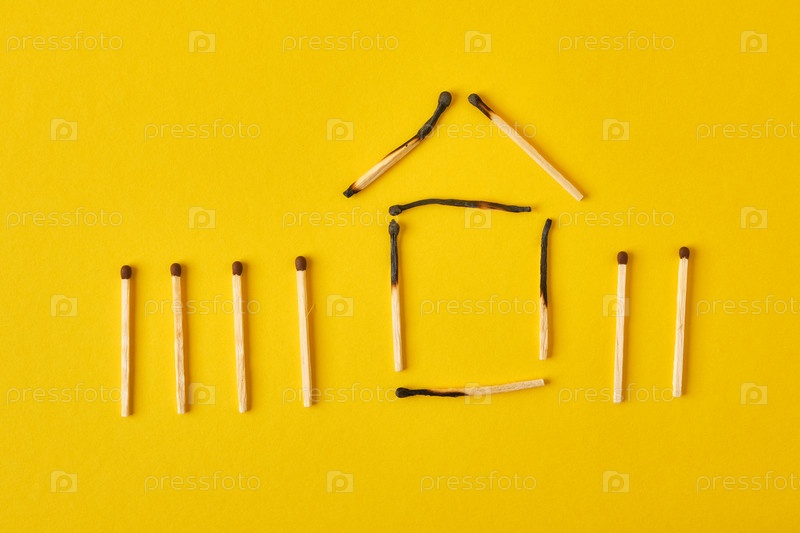 Домик из сгоревших спичек на желтом фоне