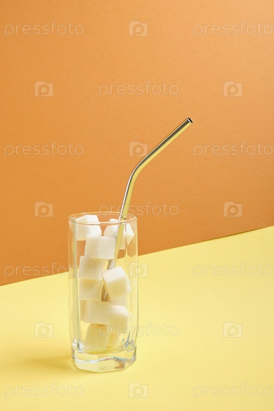 Металлическая многоразовая коктейльная трубка и кубики белого сахара в стакане, бежевом и коричневом фоне