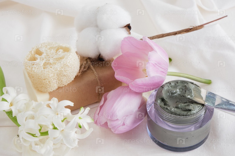 Цветы гиацинта и тюльпана, брусок мыла какао и голубой глины в банке на белой ткани, аромат теропии, концепция образа жизни без отходов