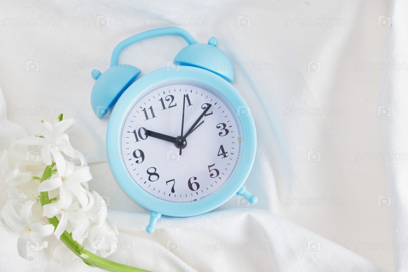 Синий будильник и цветок на кровати, концепция настроения весеннего утра