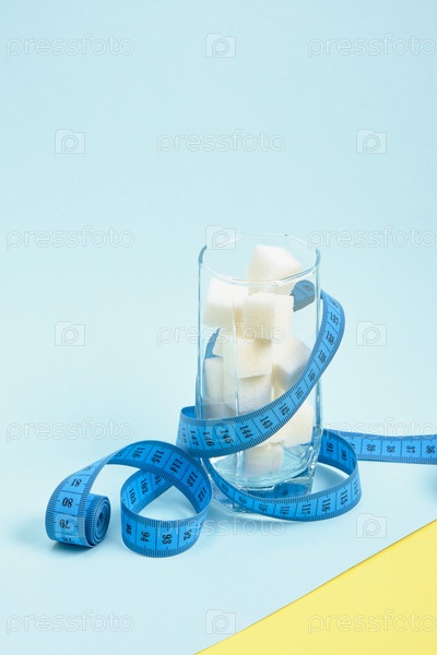 Измерительная лента и стакан с кубиками сахара на голубом и желтом фоне, концепция избыточного веса и недоедания
