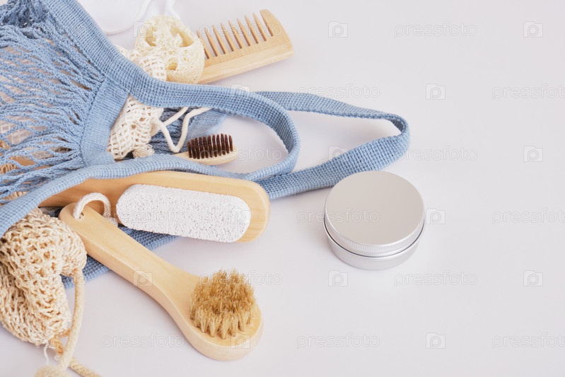 Эко-набор для ухода за телом в вязаной сумке на сером фоне, натуральная косметика и безотходный образ жизни, средства по уходу за кожей из дерева