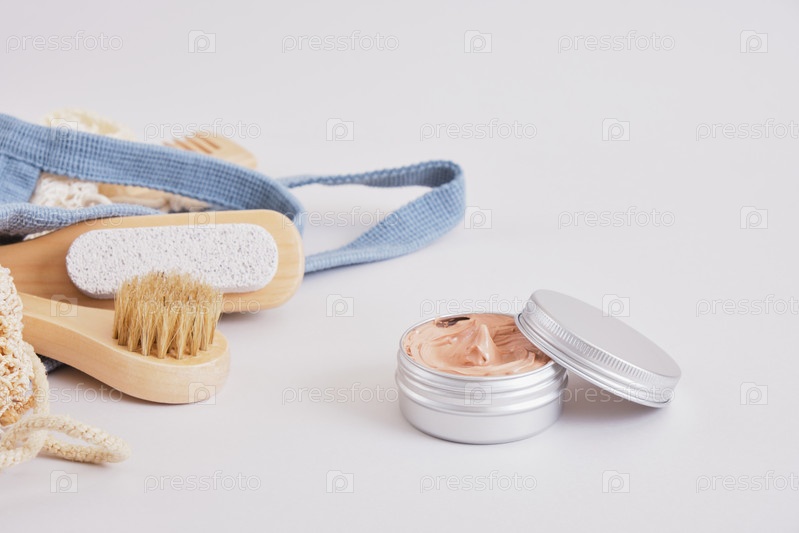 Кисточка для макияжа и косметическая красная глина в алюминиевой банке, натуральная косметика и образ жизни без отходов