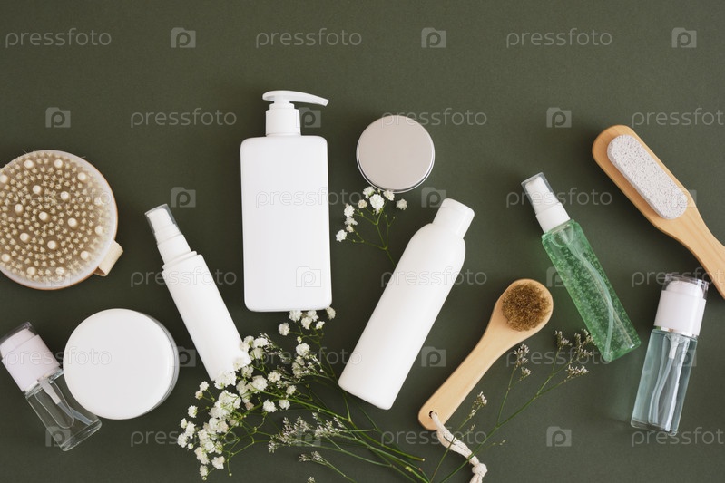 Различные макеты пустых бутылок и банок для косметики на темно-зеленом фоне, деревянные щетки для ухода за телом и массаж.Набор натуральной косметики для ухода за волосами и кожей. Вид сверху