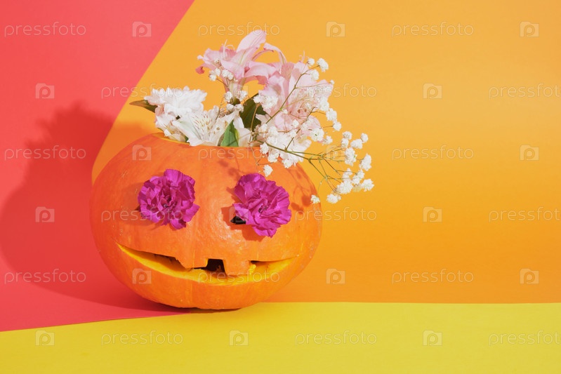 Тыквенный джек фонарь с цветами внутри на цветном фоне, концепция хэллоуина, день мертвых фон цветы в глазах тыквы