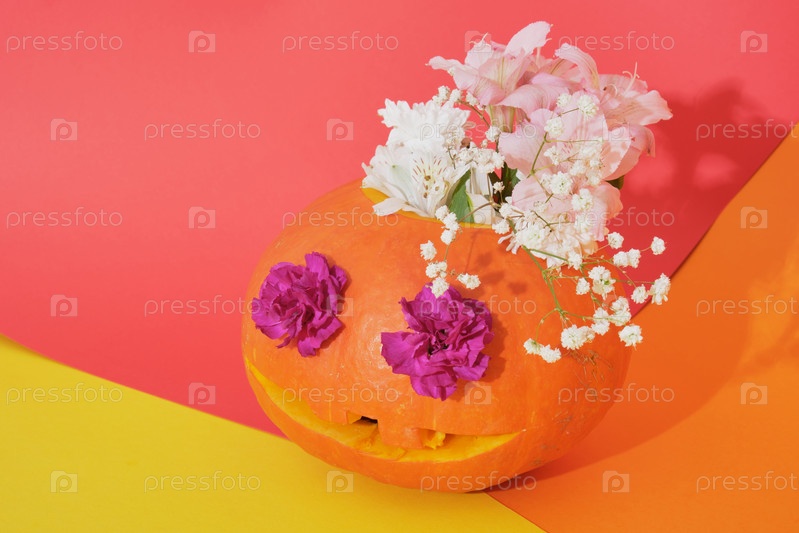 Джек фонарь с цветами внутри на цветном фоне, концепция хэллоуина, день мертвых фон