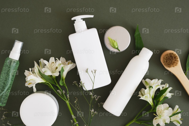 Цветы, массажная деревянная щетка, различные косметические банки и три разных пустых белых бутылки на фоне темно-зеленого фона Натуральная косметическая упаковка. макет концепции продукта красоты