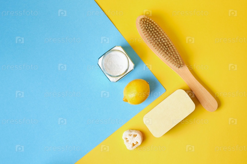 Профессиональная эко-чистка, мочалка, губка, деревянная щетка, натуральная сода, лимон на желто-синем фоне, пространство для копирования. Концепция бережной очистки