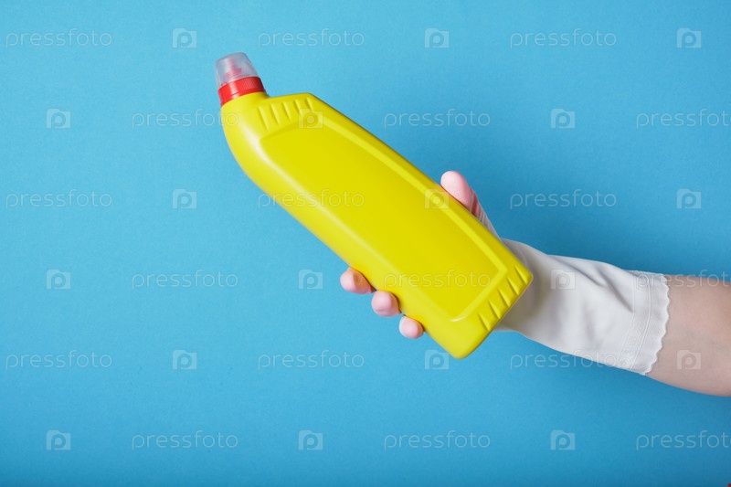 Концепция домашнего содержания образа жизни. рука в резиновой перчатке держит желтую бутылку с гелем для стирки. для туалета